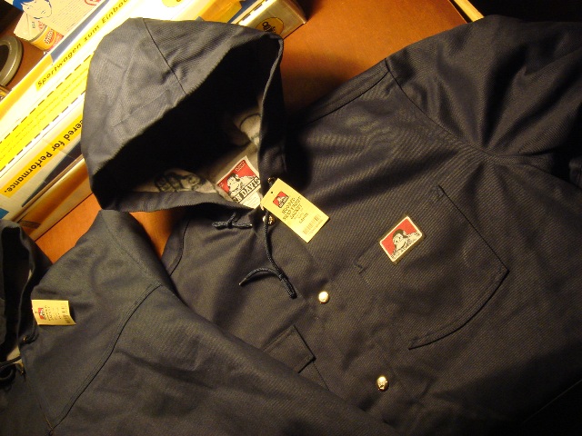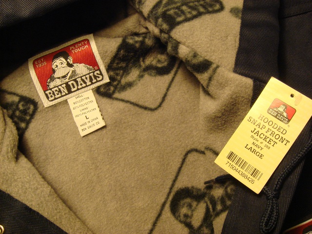 あとBEN DAVISのWORK JACKETも入荷してます★BDと言えばAPTCO愛用のユニフォームでお馴染みの老舗作業着ブランドです。DICKは日本では有名ですが個人的にはBDの方がなんかシャレオツ極まりなく感じてしまいます。昔はアメリカのX-LARGEストアにも普通に売ってた位のシロモノですから♪ 今回はheavy duty仕様のアウタージャケットです。フード付き&インナーは暖か系デス!夜のミーティングには欠かせないアイテム!!サイズはLARGEのみ色はNAVYです。価格は¥7800(税込)です。1着しかないのでコイツもお早めに!
