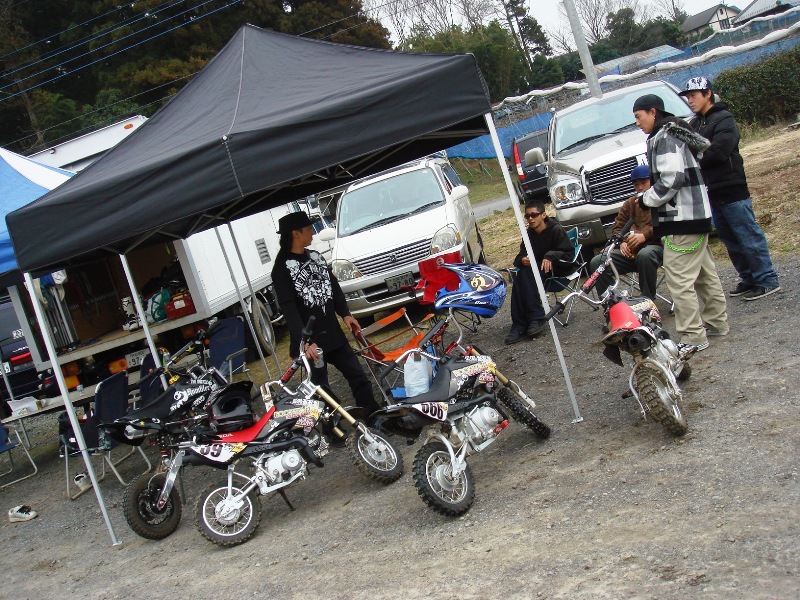 コースではすでにフリー走行が始まっており、見たことの無い台数のミニモトがコース周辺のパドックに・・・そして見たことも無いSPEEDで走るライダー達を見て総勢8名絶句・・・走る前から惨敗みたいな・・・。トボトボとパドックに戻る我々は言葉少なく肩を落とした「負け犬」スタイルに・・・守谷SAでのワクワク感から一転「ダイブ BLUE」チームに成り下がりました。8名全員の脳裏には「危険:レベル高すぎ」の文字が点滅していたことでしょう。