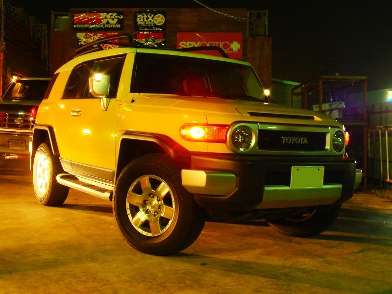 アメリカ現地で見た時は大きく感じたのだけれどおそらくノーマル車高のFJをまともに見るのが初めてのせいか、かなり小さく見えました。幅はアメリカンながら全長は460位とのことなので日本では全然行けちゃいますね!体格はBRONCOと変わらないカンジ?TOYOTAは日本国内で右ハンドルを売り出す予定だったらしいのですが構造上の問題で国内販売は白紙になったとかならないとか。このFJは期間限定生産なので数年後には新車は手に入らなくなるそうです。DUDE的にはちょいアッパーにしてインチダウンホイールにM/T履くだけでかなりキマルかなと思います。ジッサイに試乗してみたけどTACOMAと同じV6-4000はトルクフル!ガスればしっかり加速します★ショートボディならではの小回りもバツグンだしホントのところこれイイじゃんと思いました。まさに女の子のアメ車エントリーには丁度GOODかも。07yであれば350万位でアプルーブド(ディーラー認定中古)が乗り出せるから国産のSUVとか買うならこっちでしょ!しかもハイテク4WDだし!海に山に使える心強い相棒です★ルーフにサーフボード積んで海行っちゃって♪♪ FJのUSカタログあるので興味ある人は見に来てね!