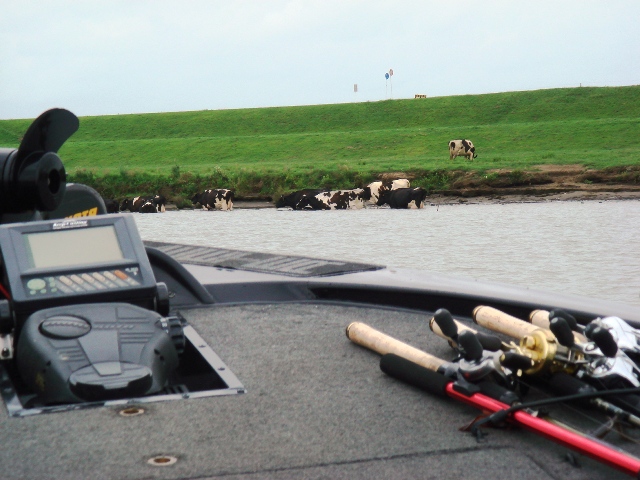 本日がバスボート乗船2回目で釣りはほぼビギナーであるワタシがいきなりトーナメント参加というのは非常に大それた事ですが何も解らないぶんかなりRELAXはしていました。とにかく釣ろう!(30cm以上だけ)その純真さが届いたのかワタクシ早々にファーストヒットで30cm後半のなかなかステキなサイズをキープ★(香取さんと行くと釣れる所に連れて行って貰えるのでね)これは優勝=アメリカ行き!?の望みが・・・一気にモチベーションが高まったのでした。その後も香取さんは何本かのバスをヒットするもキーパーサイズがなかなか出ず香取さん曰く「ツライ釣り」とのこと・・・ワタシはいつもツライ釣りしかしてないので大丈夫です・・・朝一のマグレ以来アタリ無いし・・・(苦笑) 牛の沐浴を横目に見つつシビアなコンディションは続きあっという間のタイムリミットの13時になってしまいました。