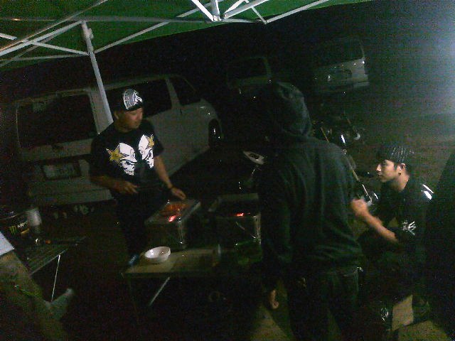 現地到着は2:00。。。んで2:30から何故か七輪にイグニッション!大人のBBQが始まりました。イカ、ウィンナー、タン塩とダイブHEAVYローテーション・・・ワタクシは4:00頃に電池切れで就寝タイムでした。