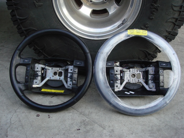 写真を見るだけだと単にハンドルを交換したように思えるのですが、実は外したハンドルの方が主役でして現在某国にて革の巻き替え&加工を施しております。サスガに13年も経つとハンドルもシートの革も痛みが酷いですからね・・・ここらでリフレッシュ+α しようかと思った次第です。とりあえずはハンドルからということで。何気にインパネ周りのモールディングもリフレッシュしようかなと思ったりもしています。仕上がりはどんなもんかご期待くださいな。